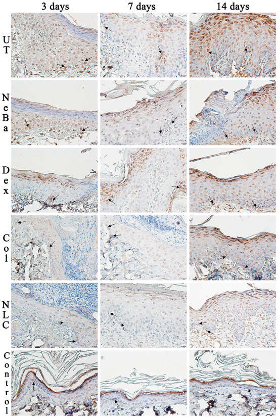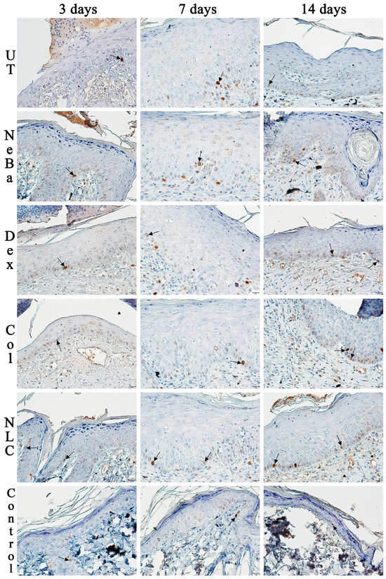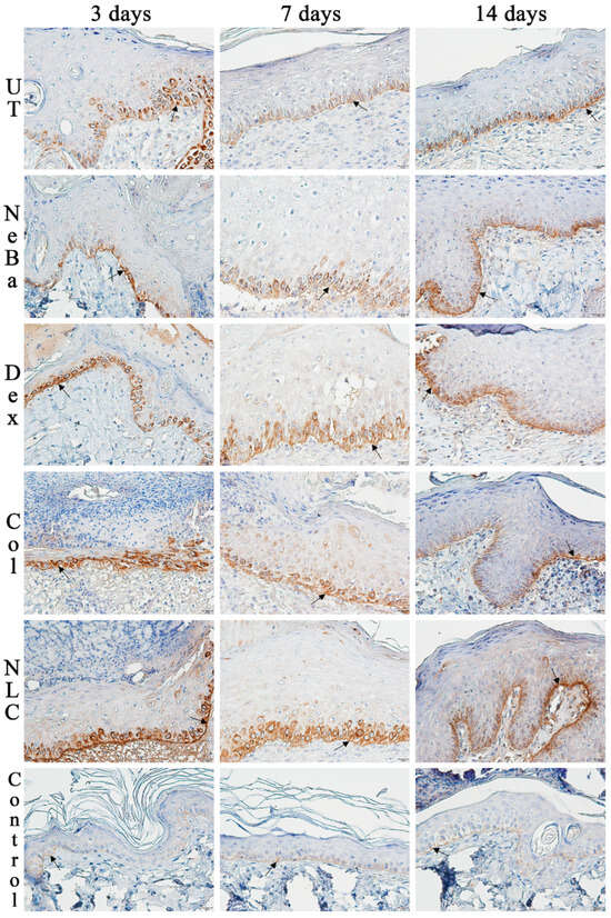 Photomicrographs of Ki-67 immunolabeling in the epidermis of wounds treated during 3, 7 and 14 days. Arrows indicate the positive Ki-67 immunolabeled cells. UT: wounded animal without treatment. NeBa: wounded animal treated with neomycin + sulfate bacitracin zinc. Dex: wounded animals treated with dexpanthenol. Col: wounded animals treated with collagenase. NLC: wounded animals treated with 1% Copaifera langsdorffii oleoresin loaded in nanostructured lipid carriers. Control: animals without lesions and treatment. Scale bar in each figure represents 20 µm.