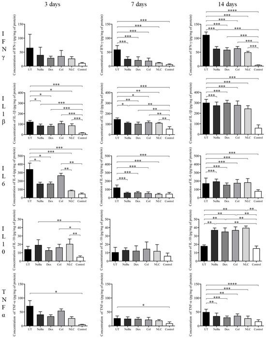 Concentrations of IFN-γ, IL-1β, IL-6, IL-10 and TNF-α (pg/mg protein) in skin wounds of rats treated for 3, 7 and 14 days. * p < 0.05, ** p < 0.01, *** p < 0.001, **** p < 0.0001 according to one-way ANOVA followed by Tukey test (n = 5/group). UT: wounded animal without treatment. NeBa: wounded animal treated with neomycin + sulfate bacitracin zinc. Dex: wounded animals treated with dexpanthenol. Col: wounded animals treated with collagenase. NLC: wounded animals treated with 1% Copaifera langsdorffii oleoresin loaded in nanostructured lipid carriers. Control: animals without lesions and treatment.