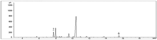 Gas Chromatography profile of the volatile oleoresin of the Copaifera langsdorffii. 2: β-caryophyllene; 6: caryophyllene oxide. Figure adapted with permission from Ribeiro et al. (2019) [24].