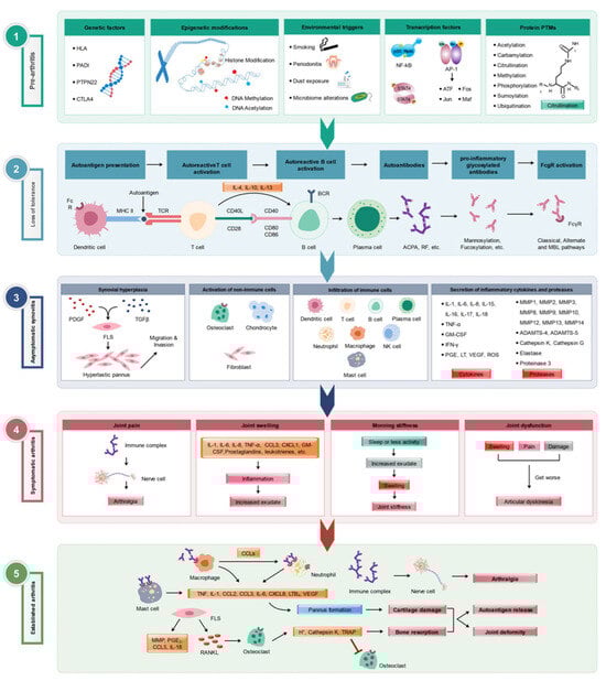 Various stages of RA development. Multiple factors involved in different (1) pre-arthritis, (2) loss of tolerance to self-antigens, (3) asymptomatic synovitis, (4) symptomatic clinical arthritis, and (5) established arthritis] phases of RA pathogenesis are depicted. Modified from [3].
