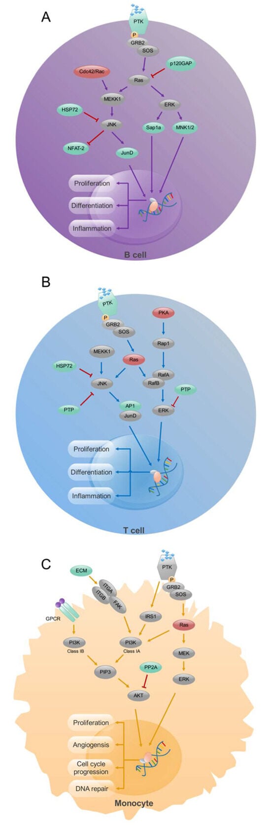 Signaling pathway analysis in CD19+ B- cells, CD4+ T- cells, and CD14+ monocytes from RA patients. Enrichment of MAPK signaling pathway in CD19+ B (A) and CD4+ T (B) cells and PI3K signaling pathway in CD14+ monocytes (C). Up-regulated (red), down-regulated (green), and unchanged (gray) genes are marked in the figure. Modified from [113].