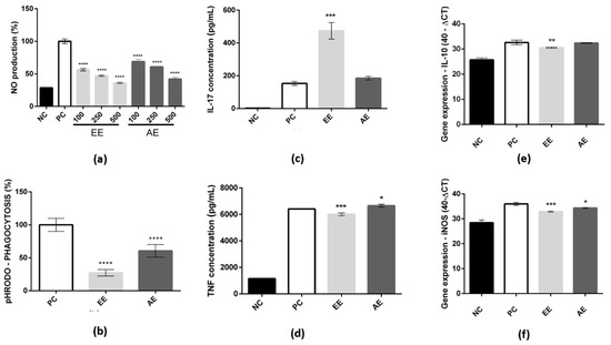EE and AE effect on RAW 264.7. In (a), NO production measurement after LPS and C. alnifolia extract treatments. The x-axis corresponds to 100, 250, and 500 µg/mL EE or AE concentrations used to treat RAW 264.7 macrophages, and the y-axis corresponds to the level of NO production. In (b), phagocytosis activity results from RAW 264.7 cells that were treated with EE and AE. The x-axis corresponds to different extracts, and the y-axis corresponds to pH RODO phagocytosis. **** indicates a significant difference between the positive control and the EE and AE concentrations. The experiments were analyzed using one-way ANOVA followed by the Tukey–Kramer test (p ≤ 0.0001). In (c,d), IL-17A and TNF-α were the cytokines measured after the RAW 264.7 were exposed to LPS and treated with C. alnifolia extracts. The x-axis corresponds to the different extracts, and the y-axis corresponds to cytokine concentration (pg/mL). In (e,f), mRNA expression was measured by qRT-PCR for the iNOS and IL-10 genes. The x-axis corresponds to different extracts, and the y-axis corresponds to gene expression. *** (p ≤ 0.001), ** (p ≤ 0.01), and * (p ≤ 0.05) indicate a significant difference between the positive control and the tested concentration (500 µg/mL) of the extracts (EE and EA); statistical analysis was performed using one-way ANOVA followed by the Tukey–Kramer test. Results are expressed as means ± standard deviation (SD). NC, negative control—cells incubated with only DMEM medium; PC, positive control—cells treated with DMEM medium and LPS at 2 µg/mL; EE—ethanolic extract; and AE—aqueous extract. These experiments were performed in triplicate and repeated three times.
