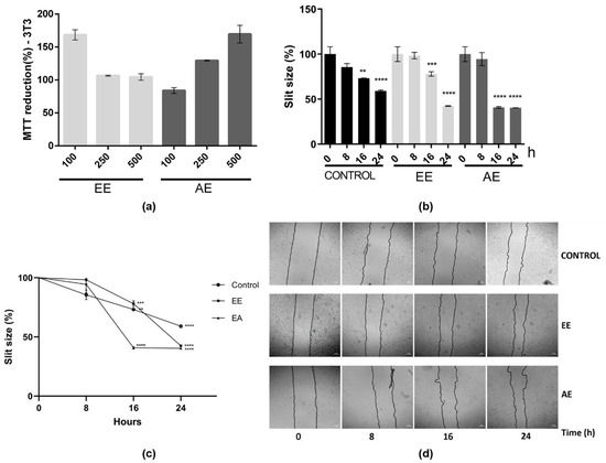 Considering that the inflammatory process plays a crucial role in wound healing, the impact of these extracts on cell migration was subsequently examined using the in vitro scratch assay. First, the cytotoxic effects of these extracts on this cell line were evaluated (Figure 3a). Both EE and AE extracts, at different concentrations (100, 250, and 500 µg/mL), did not display any cytotoxic effect. The percentage of cell growth remained consistently at or above 100% (Figure 3a). Accordingly, the concentration of 500 µg/mL was selected for further experiments, considering the non-cytotoxic nature of both extracts at this concentration.