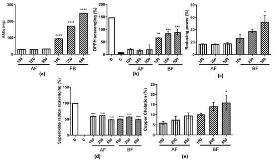 Antioxidant assays for AF and BF from C. alnifolia. (a) Total antioxidant capacity (TAC). The x-axis corresponds to AF and BF partition phases, and the y-axis corresponds to the ascorbic acid equivalents in mg (AAEq mg). (b) DPPH scavenging radical. The x-axis corresponds to AF and BF partition phases used, and the y-axis corresponds to the percentage of DPPH scavenging. B corresponds to a control only with DPPH buffer and ethanol 99%, and C corresponds to a control only with DPPH buffer. (c) Reducing power. The x-axis corresponds to AF and BF partition phases, and the y-axis corresponds to the percentage of antioxidant activity. (d) Superoxide radical scavenging. The x-axis corresponds to AF and BF partition phases, and the y-axis corresponds to the percentage of antioxidant activity. B corresponds to a control with reaction solution, and the tube was kept in a dark solution, and C corresponds to a control with reaction solution, and the tube was exposed to a fluorescent lamp. (e) Copper chelating. The x-axis corresponds to AF and BF partition phases, and the y-axis corresponds to the percentage of copper chelation. For all assays completed, the AF and BF partition phases were used in three concentrations: 100, 250, and 500 μg/mL. Each assay was conducted in triplicate and repeated three times. W and C correspond to the control tubes with only reagents without samples; W’s tube was kept in the dark, and C’s tube was exposed to light. The results were analyzed using an ANOVA and Tukey´s test. * corresponds to a significant difference between fractions at p < 0.01, ** corresponds to a significant difference between the extracts at p < 0.05, *** corresponds to a significant difference between the extracts at p < 0.01, and **** corresponds to a significant difference between fractions at p < 0.001.