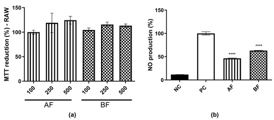 AF and BF effect on NO production. (a) MTT reduction on RAW 264.7 cell lines treated with AF and BF partition phases at 100, 250 e, and 500 µg/mL. The results were expressed as average ± SD. It was repeated three times, and it was carried out in triplicate. In (b), NO production measurement after LPS and AF and BF partition phases from C. alnifolia treatment at 500 µg/mL concentration. The x-axis corresponds to the NC treatment with medium only, the positive control PC corresponds to the cell line treated with LPS at 2 µg/mL, and the value obtained corresponds to 100% AF and BF partition phases from C. alnifolia treatment at 500 µg/mL. Y-axis corresponds to the level of NO production. The results were analyzed using an ANOVA and Tukey´s test. **** corresponds to a significant difference between partition phases at p < 0.001.