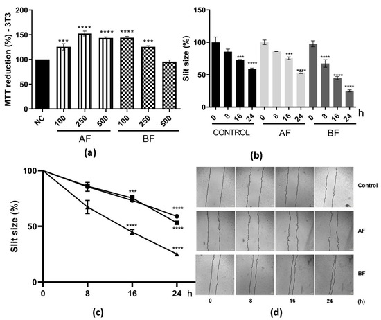 Effects of AF and BF from C. alnifolia on cell migration. (a) MTT reduction. The x-axis corresponds to AF and BF fractions at 100, 250, and 500 µg/mL, and the y-axis corresponds to MTT reduction. (b) Graphic using a bar representation of the effect of control, AF, and BF on cell migration. (c) Graphic using line representation of the effect of control, AF, and BF on cell migration. Y-axis represents the slit size percentage (measurement was determined from the edge of the scratch towards the center; that is, the total distance that the cells moved). x-axis corresponds to different treatments (control, AF, or BF) at observation time points (0, 8, 16, and 24 h). (d) The images were captured using a Nikon Eclipse inverted microscope with a 40× magnification at 0, 8, 16, and 24 h after scratch and treatment. Results are expressed as mean ± standard deviation (SD). The scratch area was analyzed using the NIS-Elements AR software ver5.42.01, and the result was considered as a percentage of scratch closure in relation to the initial area. These experiments were performed in triplicate and repeated three times. The control was cells grown with only DMEM; AF corresponds to 3T3 cells exposed to ethyl acetate partition phases, and BF corresponds to 3T3 cells exposed to butanol partition fraction. Statistical analysis was performed using one-way ANOVA followed by the Tukey—Kramer test. **** (p ≤ 0.0001), and *** (p ≤ 0.001) indicate a significant difference between the control and assay treatment with AF and BF at 500 µg/mL.