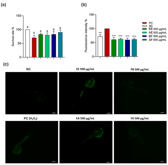 Protective effect of C. alnifolia extracts on ROS production after exposure to hydrogen peroxide (H2O2) in zebrafish embryos. (a) corresponds to survival rate from the zebrafish embryos after treatment. (b) Graph representation of fluorescent rate from the embryos after treatment. (c) Fluorescence from the embryos after treatment with 24 h treatment with DCFH-DA. EE (ethanolic extract), EA (aqueous extract), FB (butanol partition fraction), and FA (acetate partition fraction). NC, negative control—nursery water only; PC, positive control, which contains nursery water and H2O2. In (a) Different letters (a, b) correspond to statistical significance between groups (p < 0.05). In (b) *** correspond to statistical significance between groups (p < 0.05). **** (p ≤ 0.0001).