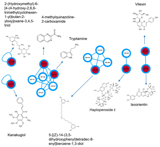 Considering the observed potential of the BF partition phase from C. alnifolia in promoting cell migration, wound healing, and exhibiting in vitro and in vivo antioxidant activity, this sample was subjected to analysis by MS/MS mass spectrometry (Table 2). A molecular network was constructed with the assistance of GNPS, highlighting the interactions between the compounds. The annotated molecules are described in Table 2. In Figure 8, it can be observed that 4-methylquinazoline-2-carboxamide interacts with tryptamine, while the other molecule interacts with vitexin and isoorientin.