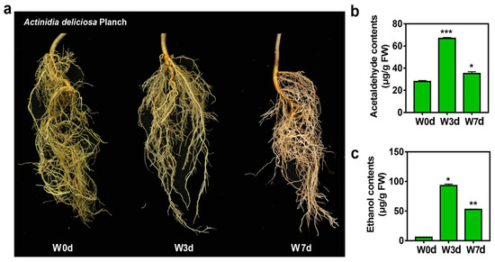 Morphological changes of kiwifruit roots under waterlogging stress. (a) Phenotypic differences of kiwifruit roots after waterlogged with 0 days (W0d), 3 days (W3d), and 7 days (W7d). (b) The acetaldehyde content in kiwifruit roots. (c) The ethanol content in kiwifruit roots. Error bars indicate ± S.E. from three biological replicates (* p < 0.05, ** p < 0.01, *** p < 0.001).