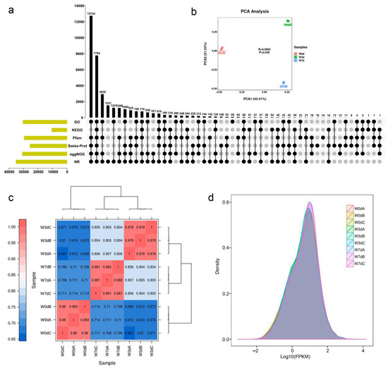 The analysis of RNA-seq in kiwifruit plants waterlogged with 0 days (W0d), 3 days (W3d), and 7 days (W7d). (a) Upset plot of transcript numbers annotated by Nr, eggNOG, Swiss-Plot, Pfam, KEGG, and GO databases. (b) PCA analysis of the three treatment groups. (c) Correlation analysis of the expression levels. (d) Density plot of expression distribution with logarithmic values of FPKM on the horizontal axis and density values on the vertical axis.