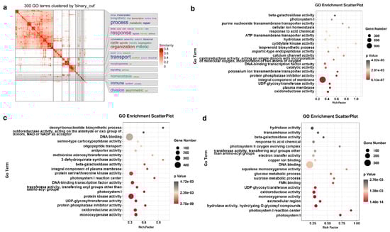 The Gene Ontology (GO) classification of differentially expressed genes (DEGs) in kiwifruit. (a) Similarity heatmap from 300 random GO terms clustered by the binary cut of all DEGs. The plot was made by the function simplifyGO(). (b) Go enrichment of DEGs between W0d and W3d. (c) Go enrichment of DEGs between W0d and W7d. (d) Go enrichment of DEGs between W3d and W7d. The color indicates terms with the p-values. Bubble size represents the ratio of DEG numbers to the total numbers of DEGs enriched on the GO terms.