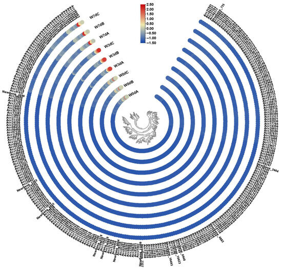 Based on the GO enrichment analysis, about 24 DEGs associated with oxidoreductase activity and 17 ones related to UDP-glycosyltransferase activity were found up- or down-regulated all the time during waterlogging stress (Tables S4 and S5). To narrow down the screening scope of candidate genes, we set parameters with FPKM values above 50 and up-regulated log2FC above 3 or down-regulated log2FC below −2 as an acceptable threshold in the present study. In consequence, only Acc10216, which was down-regulated in W0d vs. W3d and W0d vs. W7d and up-regulated in W3d vs. W7d, was screened out according to our setting parameters (Tables S5 and S6). Following these screened rules, about 4 up-regulated and 24 down-regulated candidate genes were obtained among the 346 DEGs analyzed in the former part (Table S6). Considering the fact that the prepared 283 DEGs were up- and down-regulated at different waterlogged stages in the comparisons of the three sample groups, we changed the parameters to up-regulated log2FC above 3 and down-regulated log2FC below −2 with FPKM values above 50. As a result, a total of 21 candidate genes were reserved from the 283 DEGs, among which only 50 transcripts were highly expressed with FPKM values above 100, and about 83 transcripts were accorded with the FPKM rules above 50 (Figure 5; Table S6). Finally, we obtained 50 total candidate genes related to waterlogging response possibly.