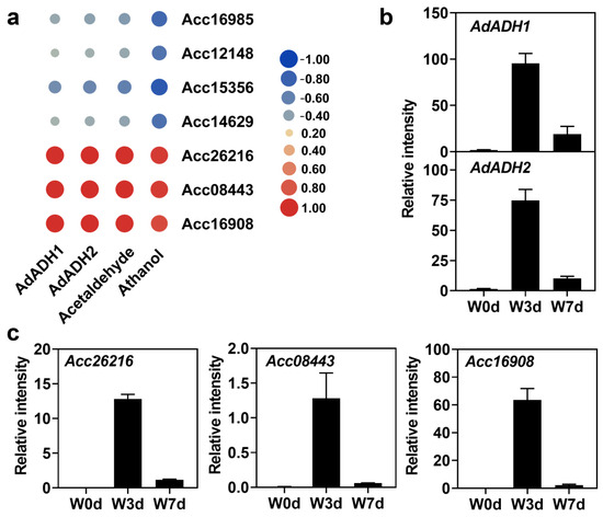 Based on current knowledge of excessive water stress, we further analyzed the candidate 50 transcripts by their predictive functional annotations. Reasonably, the anaerobic respiration-related genes AdADH1 and AdADH2 were first selected as the key genes responding to waterlogging. Thus, we calculated the correlation relationship (Pearson r) of transcript levels between the seven transcription factors (TF) and ADH genes among the 50 transcripts. Results showed that there were three TFs named Acc26216, Acc08443, and Acc16908 correlated well with both AdADH1 and AdADH2 genes among the seven screened candidates (Figure 6a). Moreover, we further found that the expression levels of the three TFs and two AdADH genes showed a good correlation with the contents of both acetaldehyde and ethanol (Figure 1 and Figure 6), indicating these genes were possibly involved in the waterlogging response. Thus, the expression of the five candidate genes was deservedly verified by RT-qPCR (Figure 6b,c).