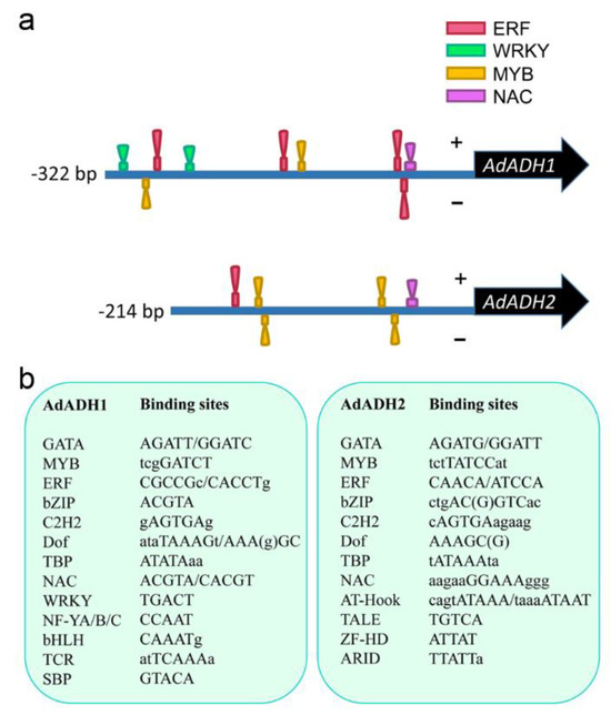 In addition, we analyzed the cis-elements in the promoters of AdADH1 and AdADH2 to see the potential transcription factors binding to these specific sequences. It is well known that the ERF, WRKY, MYB, and NAC transcription factors were involved in the hypoxia response, we focused on the binding sites of these four transcription factors in the ADH promoters. Results showed that ERF, MYB, and NAC had the potential to bind to both AdADH1 and AdADH2 promoters, while the WRKY could bind to the AdADH1 promoter but was unable to bind to the obtained sequence of AdADH2 promoter (Figure 7a). We further found that promoters of both AdADH1 and AdADH2 contained the binding sites of GATA, MYB, ERF, Dof, bZIP, C2H2, NAC, and TBP transcription factors (Figure 7b). Variously, the AdADH1 promoter included the binding sites of NF-YA/B/C, bHLH, TCR, and SBP transcription factors, and the AdADH2 promoter contained the binding sites of AT-Hook, TALE, ZF-HD, and ARID (Figure 7b).