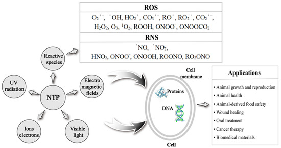 NTP technology has the advantages of safety, non-toxicity, and high efficiency, which make it widely used in disinfection and sterilization [23], would healing [24], oral treatment [25], cancer therapy [26], and biomedical materials [27]. The last two decades have witnessed the rapid development of NTP technology, from theoretical and experimental research to practical applications in various fields. Evidence from recent studies indicate that most of the activity of NTP comes from the production of reactive species (Figure 1). It remains not well known how NTP generates exogenous ROS and stimulates or regulates intracellular ROS, which induce different effects on biological targets. In addition to the wide applications in biomedicine, NTP also shows a great application potential in animal husbandry. Direct NTP treatment was found to improve the growth rate and male reproductive capacity of poultry [16,17]. NTP can also improve the appearance and flavor of animal-derived food and even affect the composition of nutrients through sterilizing and changing the structure of food [28]. In addition, NTP shows great advantages in biological oxidation. Ahmadi et al. [29] found that NTP can oxidize D-glucose through inducing the production of active substances; this provides a direction for the development of new environmental technology in the future. NTP-generated ROS can induce the oxidation of sulfhydryl-containing amino acids (such as cysteine and methionine) [30,31]. Wang et al. [32] found that NTP-generated ROS accelerated the lipid oxidation of meat. Moreover, ROS can promote the secondary oxidation of lipids to produce aldehydes or shorter chain fatty acyl compounds [33]. The above effects were mediated by the experimental parameters of NTP [32], which brought challenges to the application of NTP in animal health. Evidently, applications of NTP-mediated ROS levels are becoming more and more promising. How to precisely control the ROS levels through modulating parameters of NTP treatment on different biological targets is the key issue to be solved in clinical practice.
