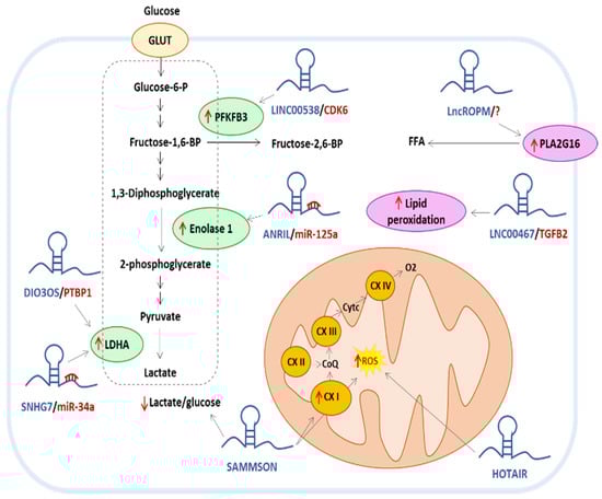 LncRNAs emerge as important regulators of mitochondrial functioning in BC cells since they can interact with the different actors of the energetic homeostasis described above (Figure 1 and Table 4).