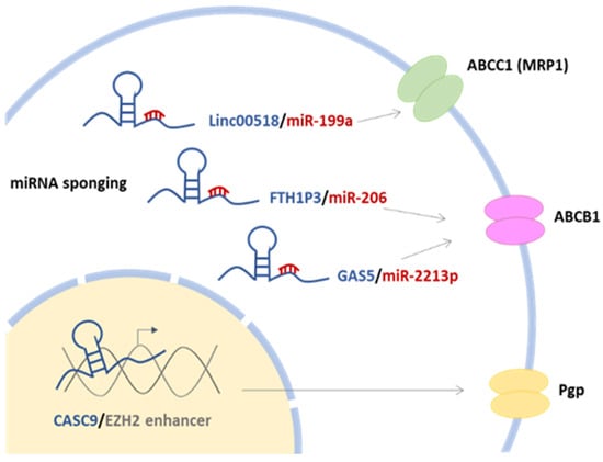 LncRNA players in regulation of efflux transporter associated with BC chemoresistance. LncRNAs can control the expression and activity of efflux pumps proteins through both transcriptional modification (CASC9 lncRNA) and miRNA sponging (Linc00518, FTH1P3, and GAS5 lncRNA).