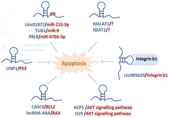 In summary, it appears that many lncRNA can contribute to BC chemoresistance through modulating apoptosis. Thus, the downexpression of CASC9, HCP5, H19, HOTAIR, LINC01977, LINP1, lnc005620, lncRNA-ARA, MALAT1, NEAT1, PRLB, and TUG1 significantly enhance the ability of chemotherapy-induced apoptosis in BC cell lines. On the contrary, the overexpression of LINC00628 and PTENP1 promotes cell apoptosis and sensitizes cells to chemotherapy. Concerning the main key ways in which lncRNA can exert its function and regulatory activities, it seems that HOTAIR, LINC01977, PTENP1, PRLB, and TUG1 act as an endogenous sponge of miRNA. Concerning MA-LAT1 and LINP1, they act on apoptosis by regulating the activity of p53. Finally, CASC9, HOTAIR, HCP5, H19, LINC00628, lnc005620, lncRNA-ARA, and PTENP1 act by inhibiting or promoting the expression of key regulators such as Bcl-2 family proteins and ITGB1 or by inhibiting or activating key regulators such as the Akt pathway. Of note, some lncRNA can act on apoptosis via several of the above-mentioned key ways as, for example, for HOTAIR or PTENP1.