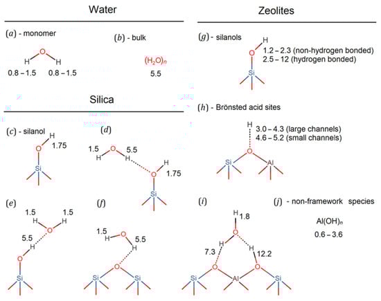 1H chemical shift in ppm (relative to TMS) for possible –OH groups in water (a,b), water–silica systems (c–f) [8], and zeolites (g–j) [27,28,29,30,31,32].