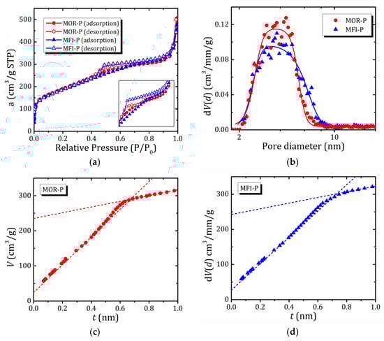 (a)—N2 adsorption/desorption isotherms of the studied pillared zeolites; (b)—pore size (d) distribution for the studied pillared zeolites obtained by NLDFT (solid lines represent a guide to the eye); (c,d)—t-plots for the studied pillared MOR-P and MFI-P zeolites, respectively.