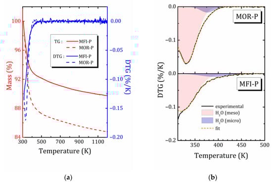 The mordenite sample is characterized by both higher water content and higher temperature of water release from mesopores (331 and 319 K for the pillared samples of mordenite and ZSM-5, respectively, according to DTG data, Figure 3b). Moreover, DTG clearly shows that MFI-P contains a considerable amount of weakly bound physically adsorbed surface water, which it loses at temperatures below 313 K. Altogether, this indicates differences in the texture of these two materials.