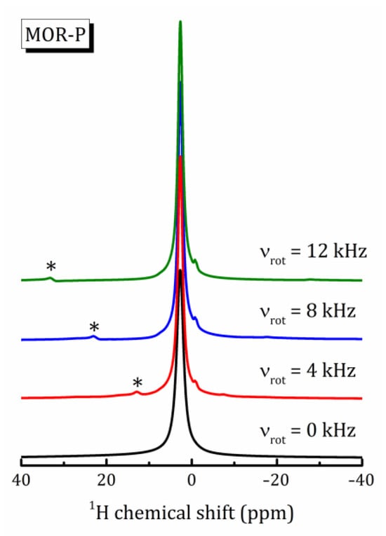 Static 1H NMR (νrot = 0) and MAS spectra recorded at rotor frequency νrot = 4, 8 and 12 kHz at T = 293 K in MOR-P; asterisks mark spinning sidebands.