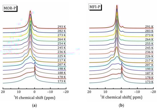 As can be seen from the above and briefly summarized in Figure 1, there is a large variety of different OH-containing species in zeolites, especially in hydrated ones, and quite often their 1H NMR signals overlap. Moreover, dynamic effects can lead to an exchange between different chemical shifts, resulting in partial or even complete averaging of the positions of the 1H NMR lines, making their assignment difficult. Nevertheless, taking into account that (i) in fully hydrated zeolites, the water signal dominates, masking the majority of the surface hydroxyl groups; (ii) the thermal behavior of the different species is different (e.g., a hydroxyl group with a stronger acid strength shows a larger change in chemical shift with temperature [39]), it is possible to attribute individual lines to different protons, and even follow up the structural changes in nanoconfined water that take place upon cooling.