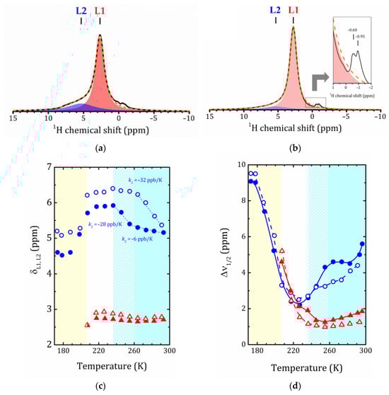 As can be seen from Figure 6c, the temperature behavior of the individual linewidths for both samples is rather similar: Δν1/2 of L1 initially remains practically unchanged upon cooling, and below 227 K it grows rapidly until it disappears. Such a temperature dependence of Δν1/2 is typical for atomic motion in solids. However, the linewidth Δν1/2 of L2 exhibits a very complex behavior (Figure 6c) that reflects the freezing out of this bulk water.
