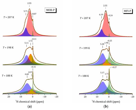 Decomposition of 1H MAS NMR spectra between 188 and 207 K for MOR-P (a) and MFI-P (b) samples.