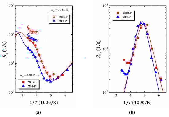 (a)—R1 relaxation rate at 400 MHz (solid symbols) and 90 MHz (open symbols) versus inverse temperature in MOR-P (triangles) and MFI-P (circles); solid lines show fit at 400 MHz using Equation (5); (b)— relaxation rate at 400 MHz versus inverse temperature at locking pulse frequency ν1 = 40 kHz; solid lines represent fit using Equation (4). The error bars are all smaller than data point symbol.