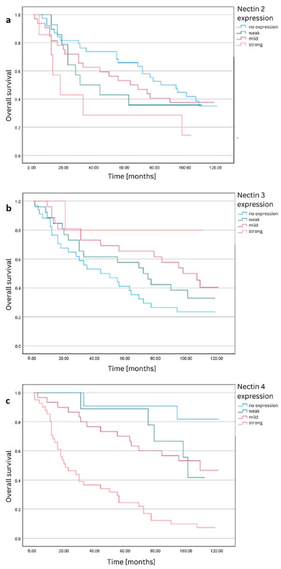 To investigate the differences in 5-year survival, we conducted functions based on the negative, low, medium, or high expression of nectins (-2, -3, and -4) using the IRS (immunoreactivity scoring system), Kaplan–Meier survival analyses (Table 1). The log-rank test was statistically significant only for nectin-4 expression, indicating significant differences in the survival function. Patients with a high nectin-4 expression had the shortest average survival and the highest mortality. The survival functions are shown in Figure 1.