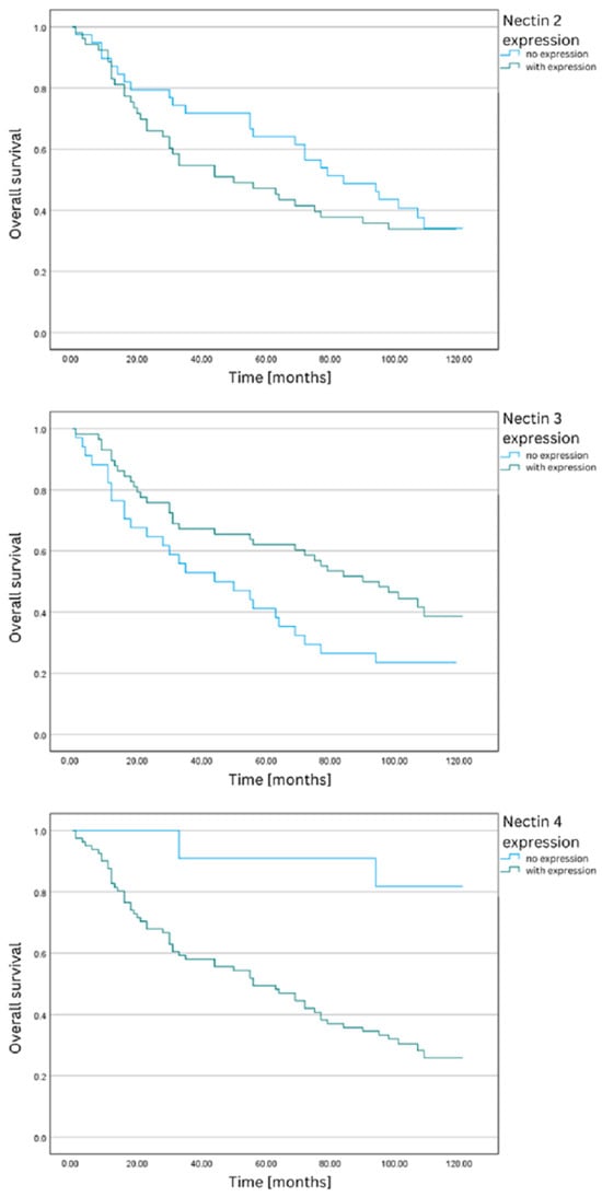 Statistical analysis was conducted using SPSS Statistica version 28.0.1. Patient survival time, based on the degree of nectin expression in histopathological specimens, was assessed using Kaplan–Meier survival estimations and log-rank tests. Additionally, the Cox proportional hazards model was employed to determine hazard ratios (HR) for nectin expression levels, providing insights into their impact on patient survival. To compare differences between quantitative and ordinal variables, we initially used the t-test for independent samples. Due to non-normality and substantial group size differences, we complemented these analyses with non-parametric Mann–Whitney tests. Normality checks were performed using the Shapiro–Wilk test. A significance level of 0.05 was adopted for all statistical tests, with p-values below 0.05 considered statistically significant. It is important to note that our collaboration with an experienced medical statistician ensured the reliability of our research and the appropriate selection of statistical methods.