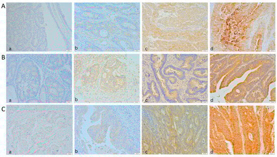 IRS Classification in sample specimens of the study group. Nectin-2 (A) strong (a), mild (b), weak (c), and without (d) expression. Nectin-3 (B) strong (a), mild (b), weak (c), and without (d) expression. Nectin-4 (C) strong (a), mild (b), weak (c), and without (d) expression. (scale: 50 μm).