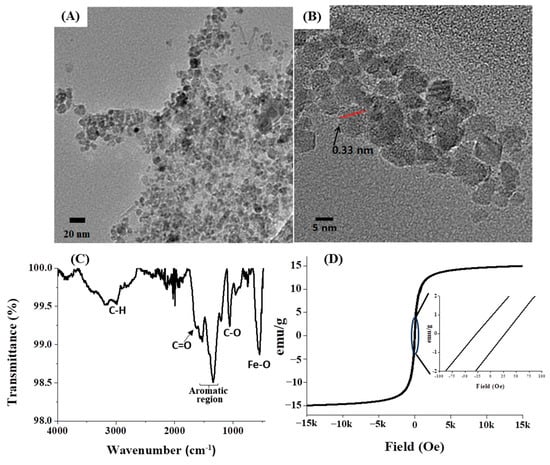 The morphology and size observations. (A) TEM image, (B) HR-TEM image, (C) FT-IR spectrum for functional group analysis, and (D) SQUID analysis for magnetic property of GA-IONP.