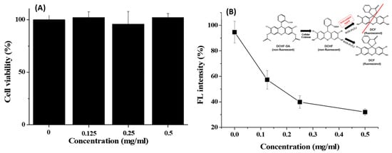 The cytotoxicity of GA-IONP was determined in the human dermal papilla cells (HDPC) at various concentrations through MTT assay for a 24 h period. As shown in Figure 2A, the cell viability remained above 95% even when exposed to concentrations as high as 0.5 mg/mL. This outcome indicated that GA-IONP exhibited no cytotoxicity and, therefore, could be effectively utilized in nanobiotechnology applications. Furthermore, its antioxidant effect was evaluated with HDPC using a DCF assay kit against H2O2 as an inducer of ROS. In general, DCFH-DA is converted to DCFH by cellular esterases in the cell, and if DCFH is subsequently oxidized by ROS, it is transformed into DCF, which emits a robust green fluorescence. This means that the fluorescence intensity of DCF varies depending on the antioxidant activity of the material against ROS, allowing for the estimation of its antioxidant effectiveness. In Figure 2B, when HDPC was only stimulated by H2O2, high fluorescent (FL) intensity was measured, and it was thought that almost all DCFH might be converted to DCF in the cell due to the activity of ROS. However, as the concentration of the GA-IONPs increased, the FL intensity decreased by approximately 70% at a concentration of 0.5 mg/mL. It meant that GA-IONPs had the function of antioxidants and acted as ROS scavengers, so they could inhibit the activity of H2O2. As a result, it was not allowed to transform from DCHF to DCF in the cell cytosol.