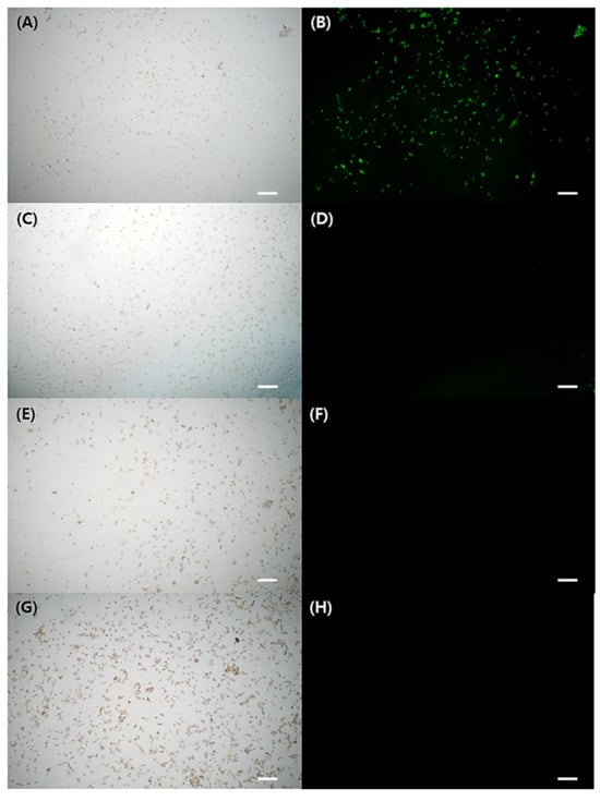 The cytoprotective properties against H2O2 stimulation. Observation of FL microscope of (A,B) without treatment of GA-IONP, (C,D) 0.125 mg/mL, (E,F) 0.25 mg/mL, and (G,H) 0.5 mg/mL of GA-IONP. The scale bar indicates 100 μm.