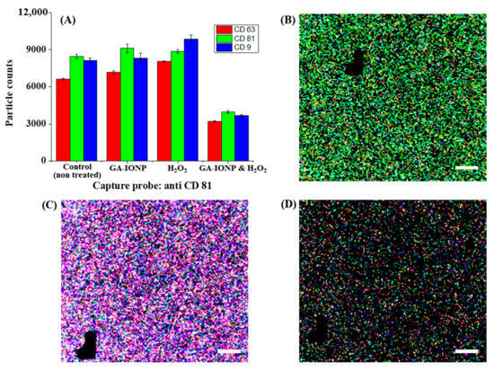 Tetraspanin characterization of HDPC-derived exosomes after H2O2 or H2O2/GA-IONP treatment on anti-CD81 capture spots. (A) Number and ratio of dye-tetraspanin-labeled exosomes and FL images of (B) control (non-treated), (C) H2O2-stimulated group, and (D) H2O2/GA-IONP treated group. The scale bar was 20 μm.