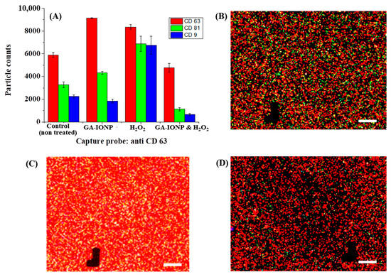 Tetraspanin characterization of HDPC-derived exosomes after H2O2 or H2O2/GA-IONP treatment on anti-CD63 capture spots. (A) Number and ratio of dye-tetraspanin-labeled exosomes and FL images of (B) control (non-treated), (C) H2O2-stimulated group, and (D) H2O2/GA-IONP-treated group. The scale bar was 20 μm.