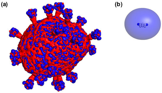 Electrostatic potential surfaces of the SARS-CoV-2 envelope (a) and MB (b) colored by red (–1 mV) and blue (+1 mV).