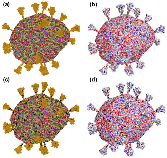 Binding of MB to SARS-CoV-2 envelope. (a) Surface of the virion envelope model, colored in accordance with the envelope component types: neutral lipids are shown in gray; negatively charged lipids are colored in different shades of red (POPI molecules—in brown; POPS—in magenta; CDL2—in red); predominant proteins are colored in different shades of yellow (the S proteins—in ochre, the M proteins—pale yellow); shown copy of the E protein is colored in white. (b) Surface of the virion colored by its electrostatic potential from −50 mV (red) to +50 mV (blue). (c,d) Electrostatic encounter complexes of MB and the viral envelope with the energy of electrostatic attraction of more than 2 kT. In (c), the color of the components of the virus envelope is the same as in (a). Centers of mass of MB are visualized as small black spheres.