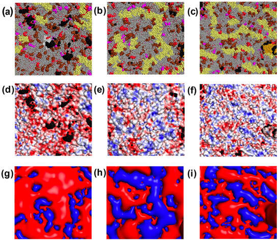 Fragments of the SARS-CoV-2 envelope with different MB binding abilities: fragment 1 (a,d,g) with high MB binding ability; fragment 2 (b,e,h) and fragment 3 (c,f,i) with low MB binding ability. In (a–c), the components of the virus envelope are colored the same as in Figure 2a. In (d–f), the surface of the virus envelope is colored by its electrostatic potential from −50 mV (red) to +50 mV (blue). Centers of mass of MB molecules are visualized as black spheres. In (g–i), the equipotential electrostatic surface –1 mV generated by electric charges of the envelope is colored in red, and the equipotential electrostatic surface +1 mV—in blue.