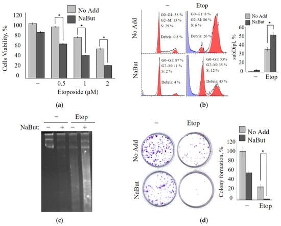 NaBut enhances the cytotoxic effect of etoposide in transformed cells. (a) The plot represents the MTT test data for the viability of mERas cells treated with etoposide alone (No Add) or in combination with NaBut (NaBut) for 24 h, as indicated. The y-axis—an absorbance at 570 nm, relative to the control sample (untreated cells). The data represent the mean ± standard error of the mean (SEM) from 3 independent experiments. * p < 0.05 by the Mann–Whitney U-test. (b) Cell cycle phases were evaluated by flow cytometry analysis in mERas cells following 24 h treatment with 2.5 µM etoposide alone or in combination with 4 mM NaBut. The blue peak on the histogram corresponds to the cells with sub-diploid DNA content. The graphs report the representative distribution, with bars showing the data from 3 independent experiments as a percentage of cells with sub-diploid DNA content. (c) Gel electrophoresis of the genomic DNA of mERas cell was performed after treatment with 2.5 μM etoposide alone (−) or in combination with 4 mM NaBut (+) for 24 h. (d) A colony formation assay was conducted in mERas cells following treatment with etoposide and/or NaBut, as described in the Section 4. The photo shows the plate with crystal violet-stained colonies, and the plot represents the colony formation efficiency presented as a percentage of control, mean ± SEM (n = 3). * p < 0.05 by the Mann–Whitney U-test.
