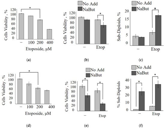 NaBut sensitizes A549 and HCT116 cells to low concentrations of etoposide. The plots represent the MTT data for the viability of A549 (a,b) or HCT116 cells (d,e). (a,d) Cells were treated with increased concentrations of etoposide, as indicated, for 24 h; (b,e) cells were treated with 5 µM etoposide alone (light bars) or 5 µM etoposide in combination with 4 mM NaBut (dark bars). Results are presented as mean ± SEM of percent of control (untreated cells). (c,f) The histograms of the flow cytometry data for A549 (c) or HCT116 cells (f) following the treatment with 5 µM etoposide alone (light bars) or 5 µM etoposide in combination with NaBut (dark bars) 24 h. Bars show the percentage of cells with DNA content below the threshold for cells in G1 (% Sub-Diploids). The MTT and flow cytometry data represent the mean ± SEM from 3 independent experiments. * p < 0.05, by Mann–Whitney U-test.
