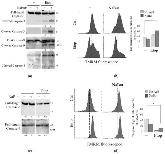 Etoposide induces mitochondria-mediated apoptosis, a process that is mitigated by the overexpression of Bcl-2. (a,c) Western blot analysis was conducted to detect cleavage of caspases-3, -8, and -9 in mERas (a) or mERas-Bcl2 cells (c) treated with etoposide (Etop) alone (−) or in combination with NaBut (+) for 24 h. The numbers under the bands represent band densities, calculated using ImageJ© software (version 1.53e). These densities were then scaled to the load control density and normalized against the untreated control (fold changes). (b,d) Assessment of TMRM staining in mERas (b) or mERas-Bcl2 cells (d) was conducted on cells that were either left untreated (Ctrl) or treated for 24 h with etoposide alone (−) or in combination with NaBut. TMRM staining was monitored by flow cytometry, and representative cytofluorimetric plots are shown. The graphs represent the percentage of cells below the threshold, marked as a dotted line. The dotted line indicates the position of the peak of fluorescence intensity distribution in the control sample. The asterisk (*) denotes statistical significance (p < 0.05), as determined by the U-test.