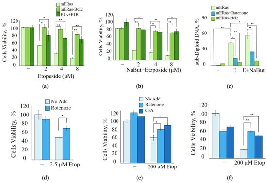 Mitochondrial inhibition attenuates the antiproliferative effect of etoposide. (a,b) Cell viability was assessed using MTT assay, with results presented as a percentage of control. The data are expressed as mean ± SEM, n = 3. (a) mERas cells (light green), mERas-Bcl-2 (green) or E1A + E1B cells (dark green) were either untreated or treated with increased concentrations of etoposide (2–8 μM) alone. (b) The same cell lines were treated with etoposide in combination with NaBut for 24 h. (c) Histogram of cell flow cytometry data. mERas cells were subjected to different treatments for 24 h: 2.5 μM etoposide alone (E) or etoposide in combination with NaBut (E + NaBut)—light green bars. Simultaneously, the same treatments were conducted with the addition of 50 nM rotenone (mERas + rotenone)—blue bars. Bcl-2 overexpressing mERas cells were also treated with etoposide and NaBut, as described above (mERas-Bcl-2)—green bars. The bars in the histogram represent the proportion of cells in the sub-diploid region of the flow cytometry plots. (d–f) MTT tests for viability of mERas (d), A549 (e), and HCT116 cells (f) treated with etoposide alone, as indicated (light blue), or in combination with 50 nM rotenone (blue) or 2 μM cyclosporine A (navy) for 24 h. Results are presented as the percentage of viable cells compared with that of untreated control. The MTT and flow cytometry data represent the mean ± SEM from 3 independent experiments. * p < 0.05, ** p < 0.01 by U-test.