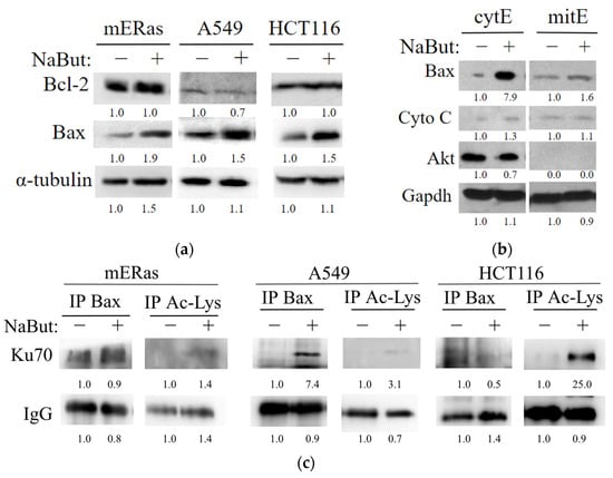 NaBut induces Bax accumulation in cytoplasm of HDACi-resistant cells due to the Bax retention in complexes with Ku70. (a) Western blotting of total cell extracts from HDACi-resistant mERas and A549, as well as HDACi-sensitive HCT116 cells, treated with 4 mM NaBut for 24 h. (b) Western blotting of the cytoplasmic (cytE) and mitochondrial fractionated extracts (mitE) from HDACi-resistant mERas cells. Western blotting with Akt antibodies served as a marker for cytoplasmic extracts. (c) Western blotting with antibodies to Ku70 of proteins co-precipitated with antibodies to Bax or acetylated lysine (Ac-Lys) from HDACi-resistant (mERas and A549) and HDACi-sensitive (HCT116) cells. These cells were either untreated (−) or treated with NaBut for 24 h (+). The numbers under the bands represent band densities calculated by ImageJ© software (version 1.53e), scaled to the load control density, and then normalized against the untreated control (fold changes).