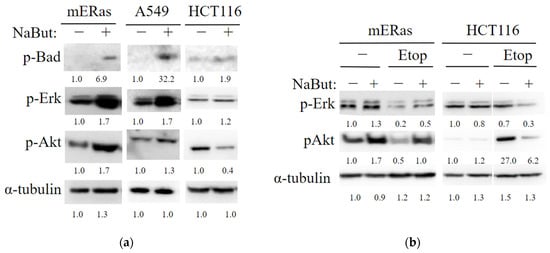 The anti-apoptotic family members Bcl-2 and Bcl-xL prevent Bax from incorporating into the mitochondrial membrane, a process that can be inhibited by the Bad protein. The activity of Bad, which is regulated by the Ras-mitogen-activated protein kinase pathway [22,23], was investigated under HDACi treatment. Western blot data in Figure 6 indicate that NaBut increases the phosphorylation of the Bad protein and activates the upstream effector kinases Erk and Akt in HDACi-resistant mERas and A549 cells (Figure 6a). This prevents Bax from moving from the cytoplasm to the mitochondria. Conversely, In HCT116 cells, which undergo apoptotic death under NaBut treatment, there is no increase in the phosphorylation of Erk and Akt kinases (Figure 6a).