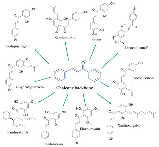Chemically, chalcones are derivatives of aromatic ketones, 1,3-diphenyl-2-propen-1-ones, a precursor of flavonoid biosynthesis [26]. Based on the type of subtraction, chalcones are generally classified into hydroxy chalcones, methoxy chalcones, amino chalcones, aryl chalcones, alkyl chalcones, nitrogenous chalcones, and other subclasses less representative [22] (Figure 1). Considering that the simple chalcone structural scaffold can be functionalized at multiple sites with different chemical moieties, these molecules could respond to different molecular targets or interfere with different signaling pathways in humans with a specific structure–activity relationship [27].
