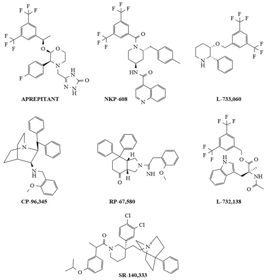 Non-peptide NK-1R antagonists are lipid-soluble compounds that show a different chemical composition (benzyl ether piperidines, benzylamine/benzyl ether quinuclidine, benzyl amino piperidines, steroids, tryptophan derivatives, perhydro isoindolines) (Figure 2) but have a similar affinity for NK-1R [52,85].