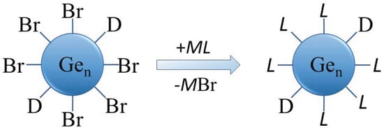 Schematic representation of the substitution of Br with organic or other functional groups for surface functionalization of the Ge nanoparticles (D = donor (PnBu3), M = alkaline or alkaline earth metal, L = ligand).